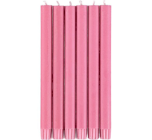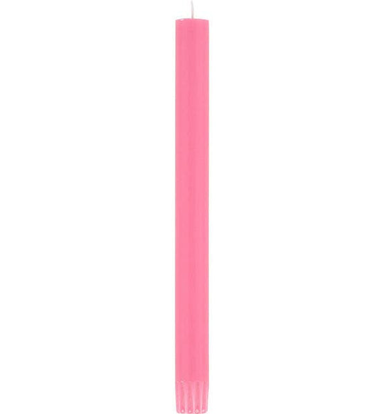 Our eco, fair trade dinner candles, hand poured in British Colour Standard Neyron Rose. A colour standardised in 1934, from the rose ‘Paul Neyron’, established in 1869. A typical ‘cabbage rose’, with large, fragrant, rich pink flowers. A strong, rich, pink. 24.5cm Tall 8 hour burn time, with a tall clean flame. Non-drip, hand poured in Indonesia No animal derived ingredients 100% Stearin wax (veg origin) Pure cotton wick (lead/metal free) Ecological colour dyes, paraffin free. Candle Care & Safety: Best when lit for 4 hours at a time Stop burning when 2cm of unmelted candle remains Leave 10 cm between candles when burning