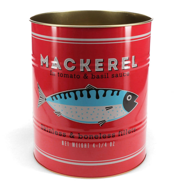 Pair of XL metal storage tins with retro style anchovy and mackerel fish branding, inspired by vintage food cans. Ideal for organising and displaying larger items, including craft tools and more. Similar storage tins in other sizes are also available.