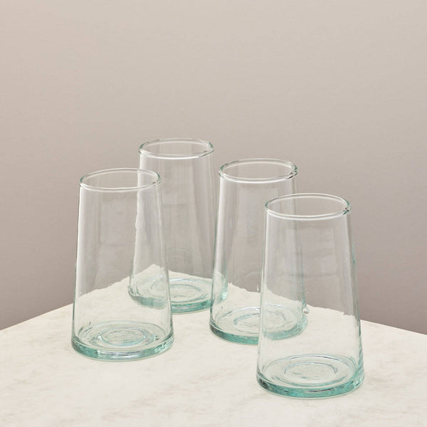 Description A set of four Highball glasses, our tallest glass. The perfect water glass or for serving long-cocktails, gin and tonic, soda, beer and cider. The Highball glasses are also sold individually. All our products are handmade using recycled glass. Each piece is completely unique and individual with the colour and appearance varying slightly. Dimensions Capacity: 330ml Height: 12cm Width: 7cm Care We will always recommend love and careful handling of our products, but if washing up isn’t for you, these glasses can be washed in domestic dishwashers.